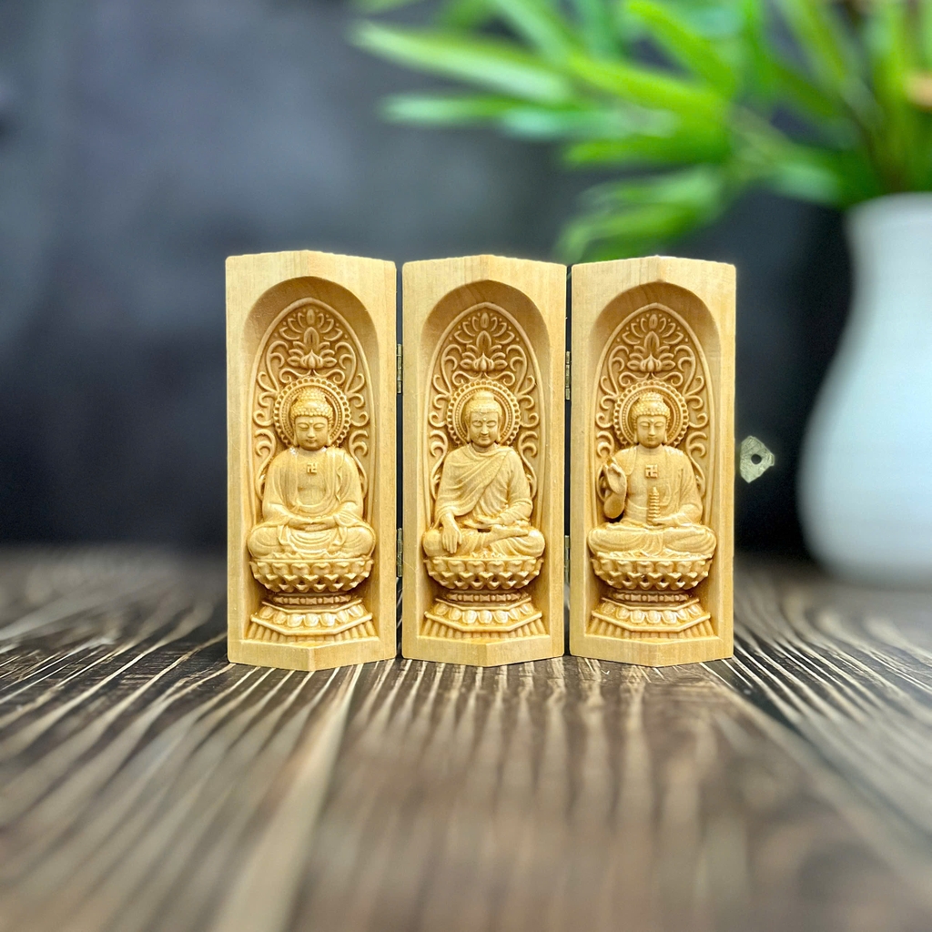 - Bộ tượng gồm 3 vị Phật được gắn với nhau bằng lề và khóa, có thể dễ dàng đóng mở, thuận tiện mang theo trong những chuyến đi xa.