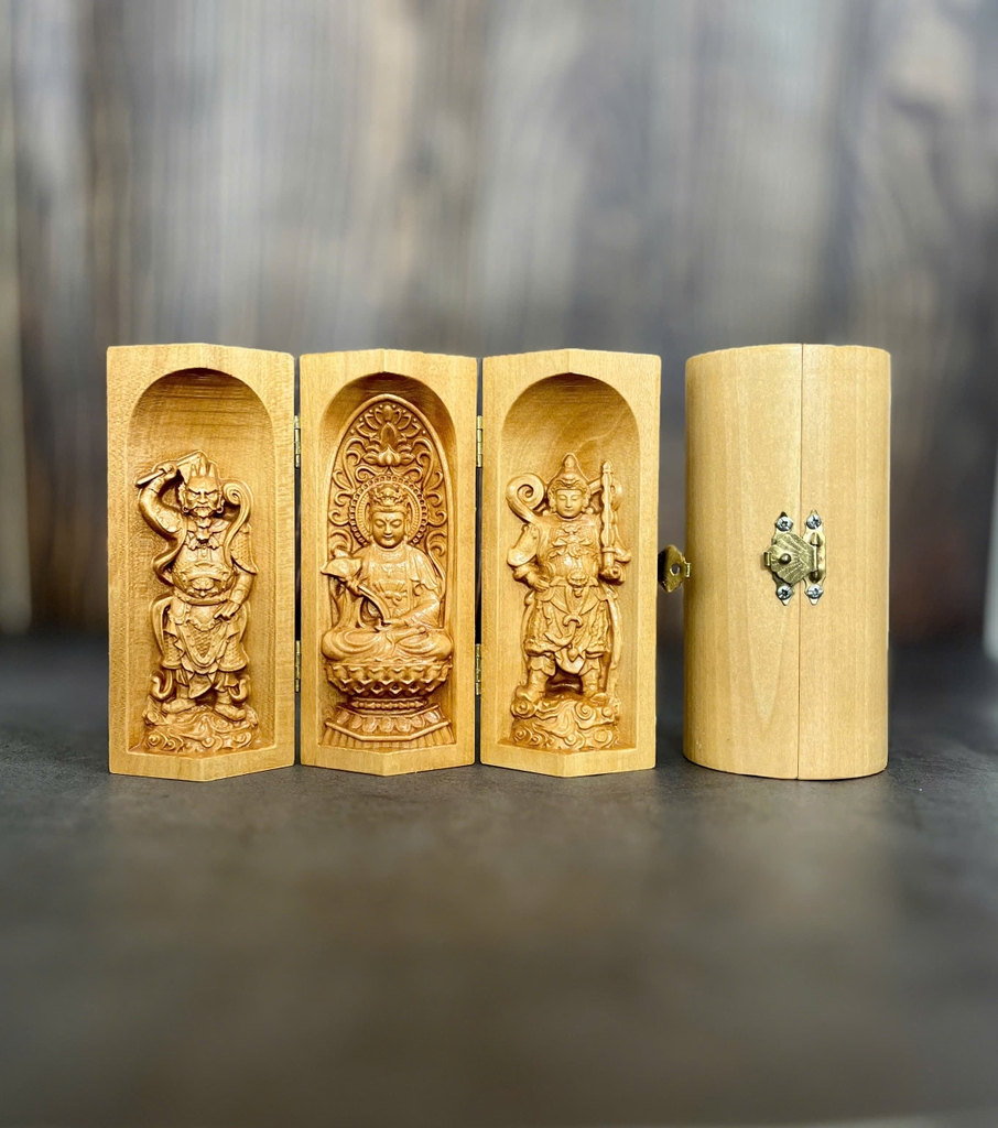 - Mỗi bộ tượng được tặng 1 túi nhung đỏ bảo vệ gỗ và 1 chuỗi hạt gỗ bách xanh 108 hạt 6 li – thích hợp để niệm Phật, tụng kinh, hoặc làm vòng phong thủy hộ thân.