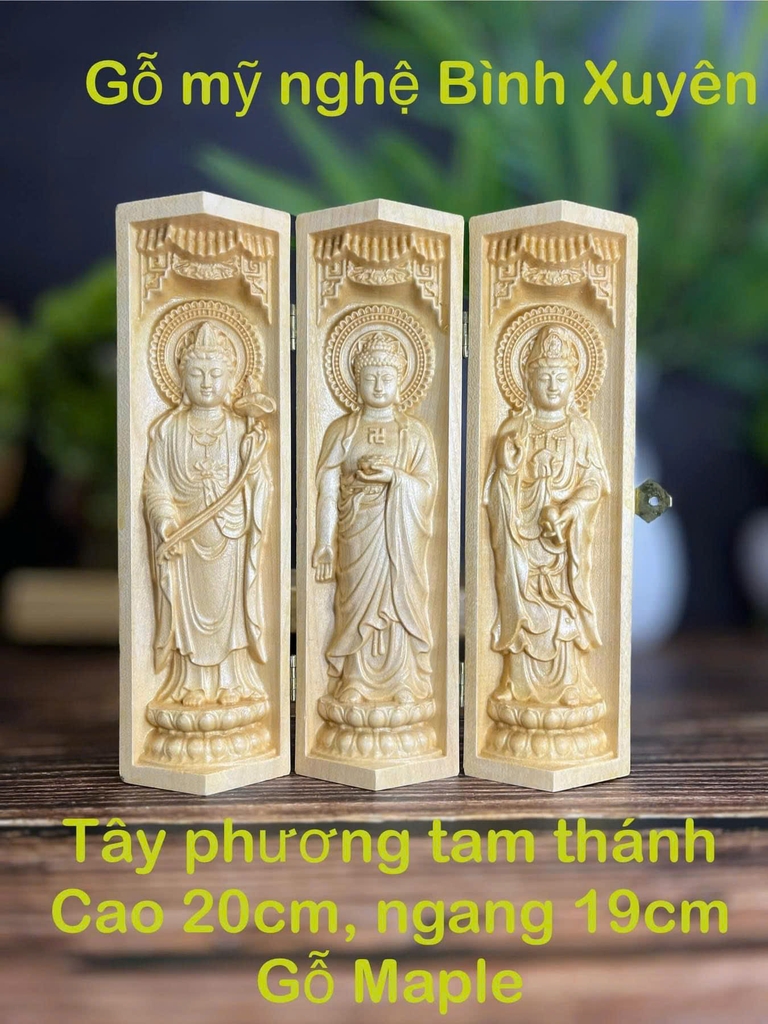 Bộ tượng gấp gọn Tây Phương Tam Thánh, gồm 3 Vị : Đại Thế Chí Bồ Tát – Phật A Di Đà – Quan Thế Âm Bồ Tát