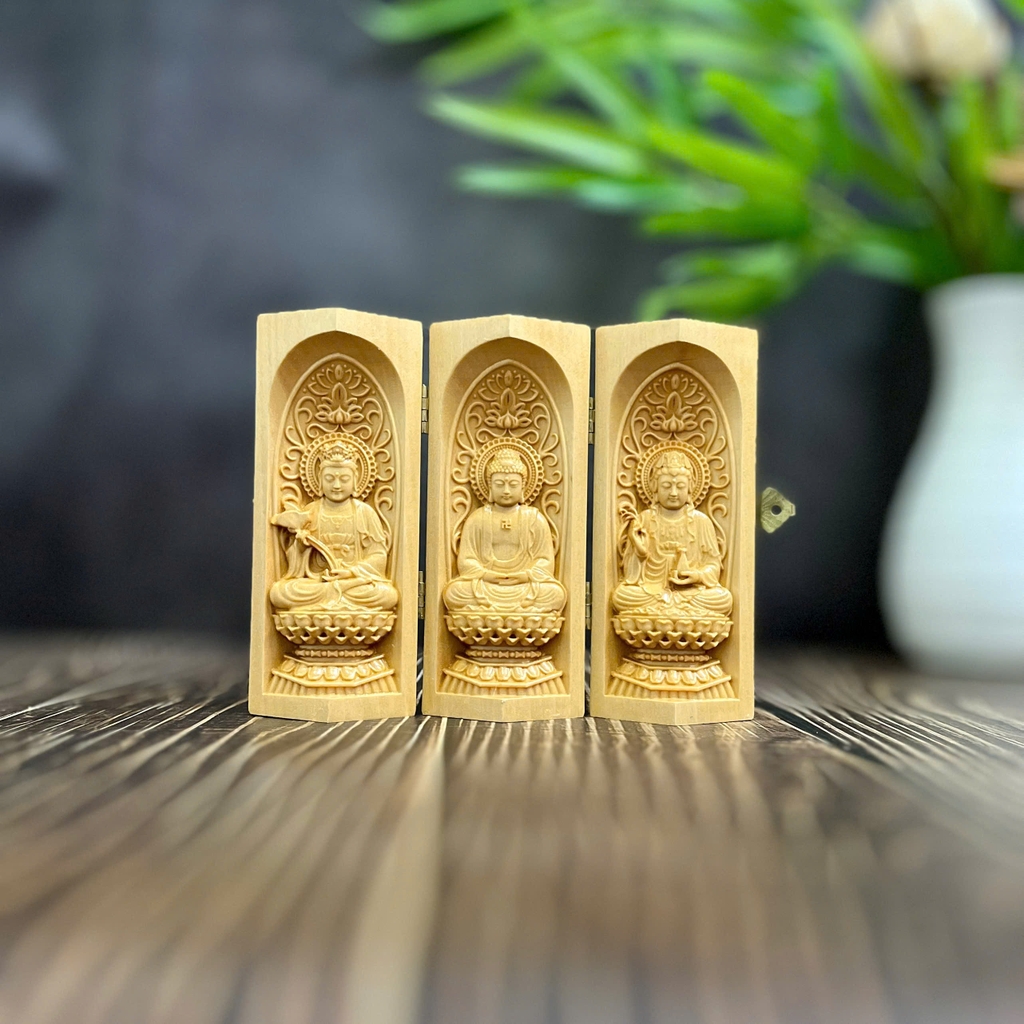 - Bộ tượng gồm 3 vị Phật – Bồ Tát, được gắn với nhau bằng lề và khóa, có thể dễ dàng đóng mở, thuận tiện mang theo trong những chuyến đi xa.