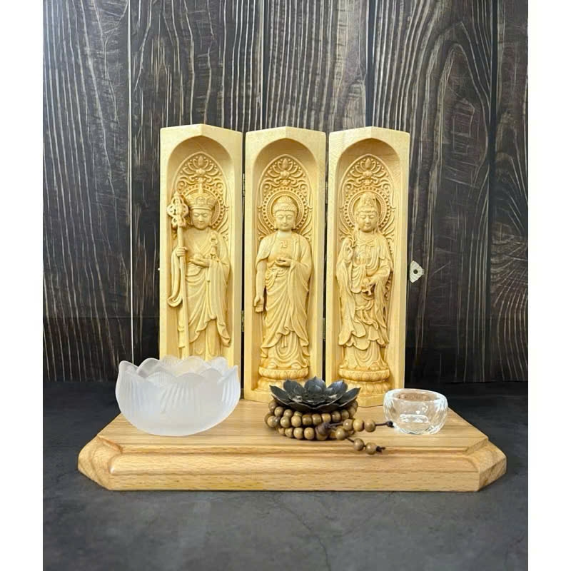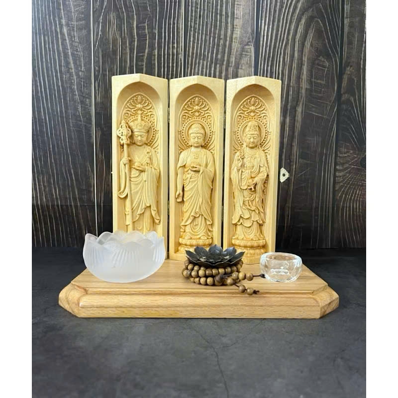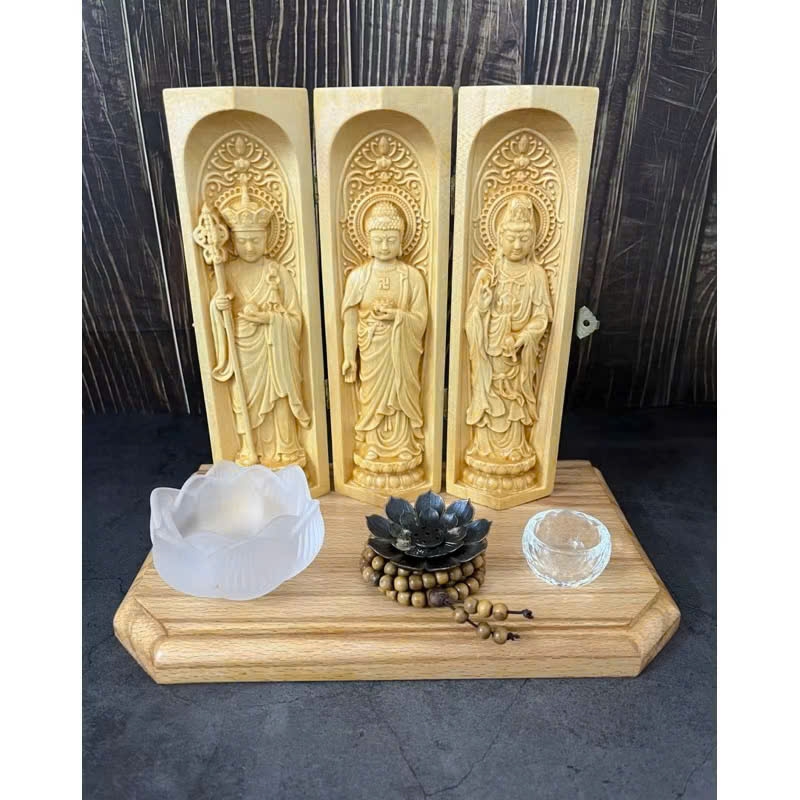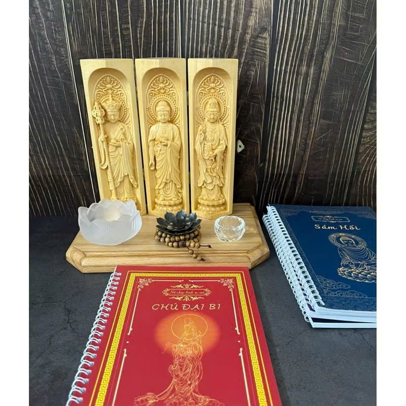 • Bộ tượng Phật gồm 3 vị Địa Tạng Bồ Tát - Phật A Di Đà - Quan Thế Âm Bồ Tát chạm khắc tinh xảo trên gỗ Bồ đề, loài cây gắn liền với sự giác ngộ của Đức Phật, mang ý nghĩa phong thủy may mắn, tốt đẹp cho gia chủ, vân gỗ láng mịn, màu vàng tươi tự nhiên, gỗ đã được sấy khô hạn chế cong vênh, nứt nẻ. Kích thước cao 20cm, ngang 19cm.