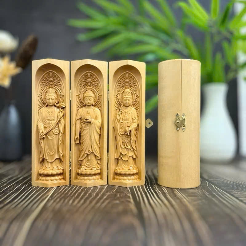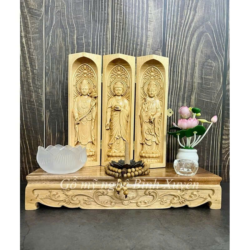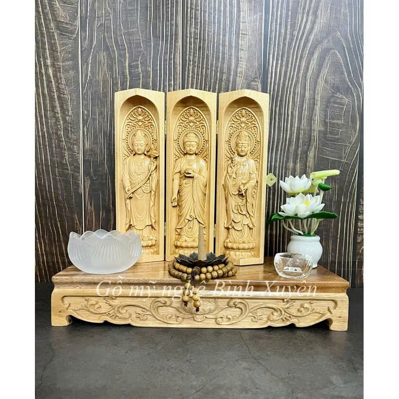 • Bộ tượng Phật gồm 3 vị Đại Thế Chí Bồ Tát - Phật A Di Đà - Quan Thế Âm Bồ Tát chạm khắc tinh xảo trên gỗ Bồ đề, loài cây gắn liền với sự giác ngộ của Đức Phật, mang ý nghĩa phong thủy may mắn, tốt đẹp cho gia chủ, vân gỗ láng mịn, màu vàng tươi tự nhiên, gỗ đã được sấy khô hạn chế cong vênh, nứt nẻ. Kích thước cao 20cm, ngang 19cm.
