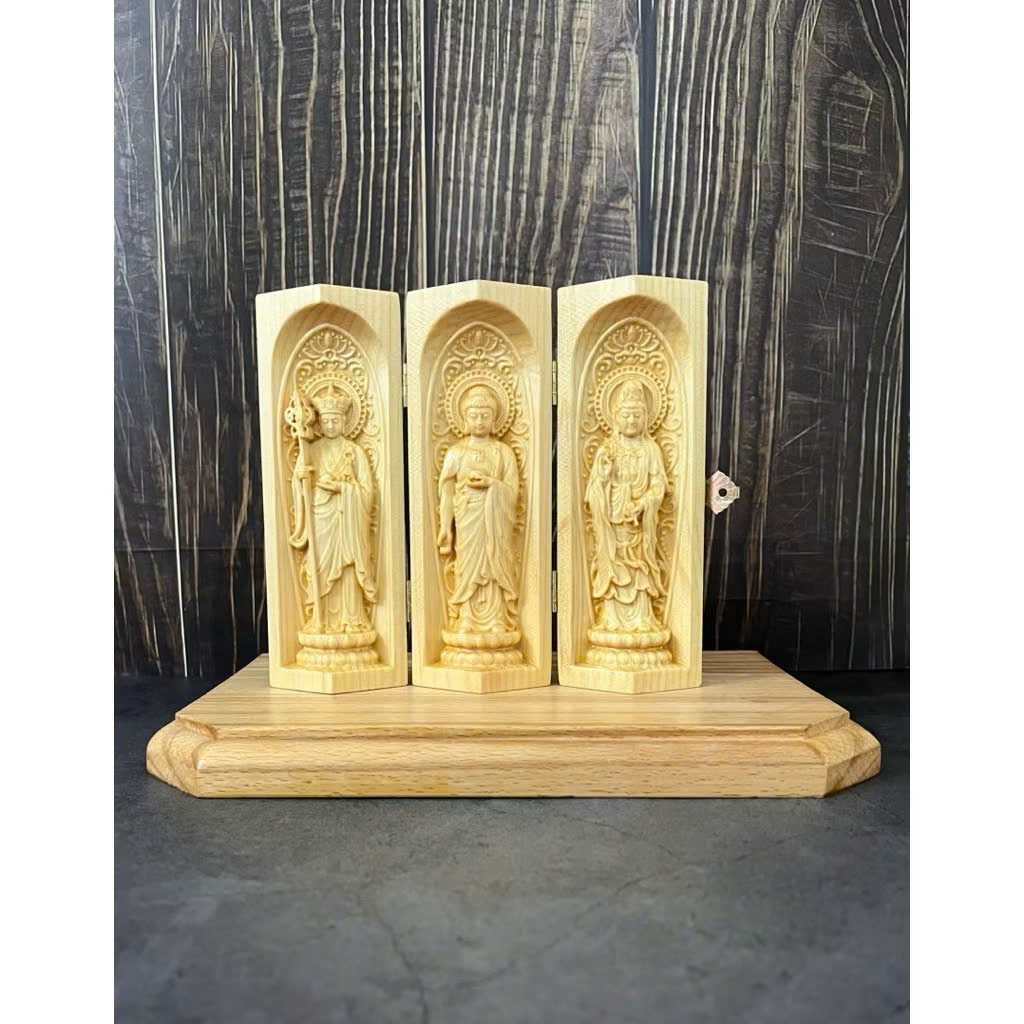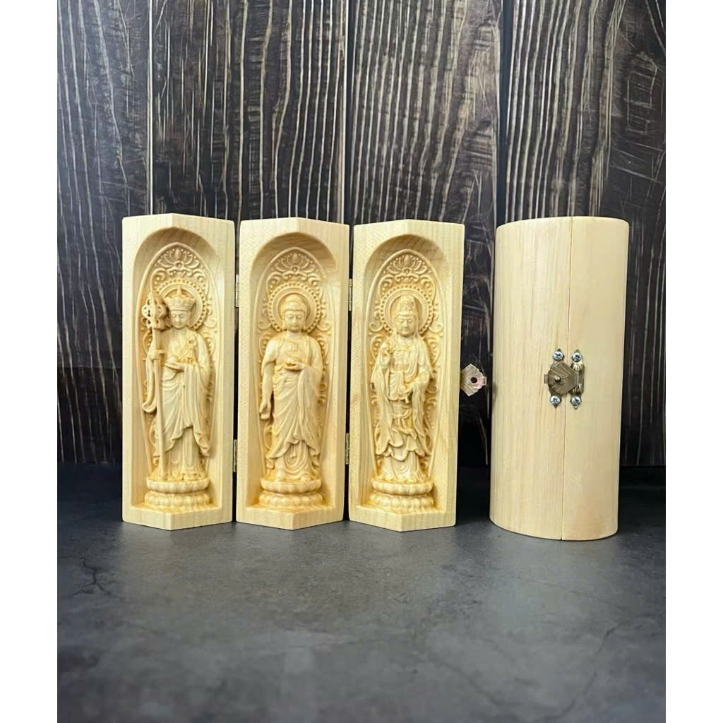• Bộ tượng Phật gồm 3 vị Địa Tạng Bồ Tát - Phật A Di Đà - Quan Thế Âm Bồ Tát chạm khắc tinh xảo trên gỗ Bồ đề, loài cây gắn liền với sự giác ngộ của Đức Phật, mang ý nghĩa phong thủy may mắn, tốt đẹp cho gia chủ, vân gỗ láng mịn, màu vàng tươi tự nhiên, gỗ đã được sấy khô hạn chế cong vênh, nứt nẻ. Kích thước cao 15cm, ngang 18cm.