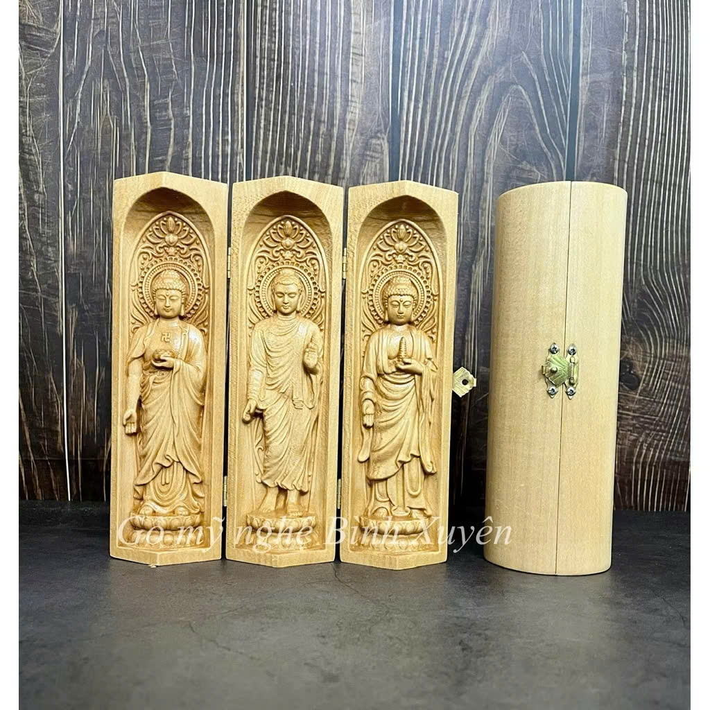 - Bộ tượng gồm 3 vị Phật được gắn với nhau bằng lề và khóa chắc chắn, có thể dễ dàng đóng mở, thuận tiện mang theo trong những chuyến đi xa.