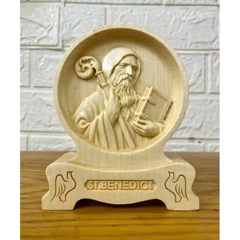 His symbols include the Benedictine Cross, the Rule book, and the poisoned cup with a serpent. He is honored as the Patron Saint of Europe and monastics.