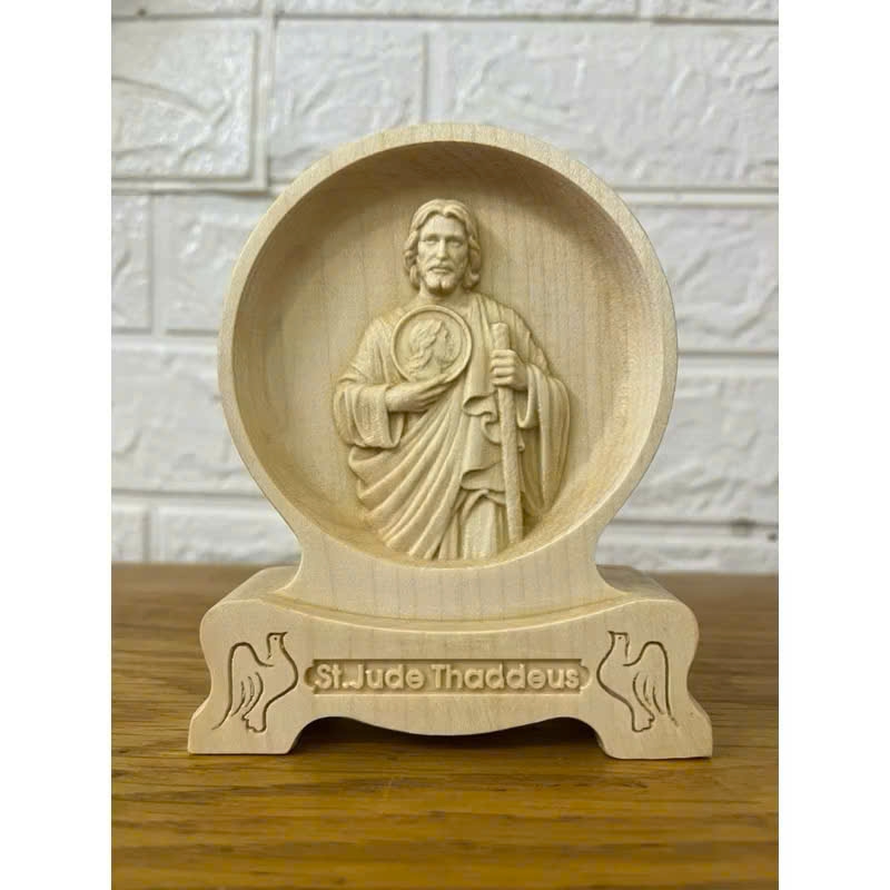 Saint Jude Thaddeus, one of the Twelve Apostles of Jesus, is often depicted with the image of Christ on his chest or holding a book or staff.