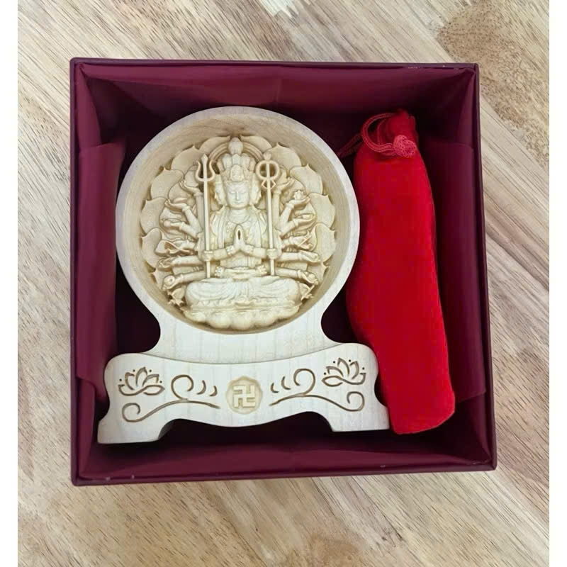 - Mỗi tượng được tặng 1 hộp đỏ bảo vệ gỗ và 1 vòng tay bằng gỗ – thích hợp để niệm Phật, tụng kinh, hoặc làm vòng phong thủy hộ thân.